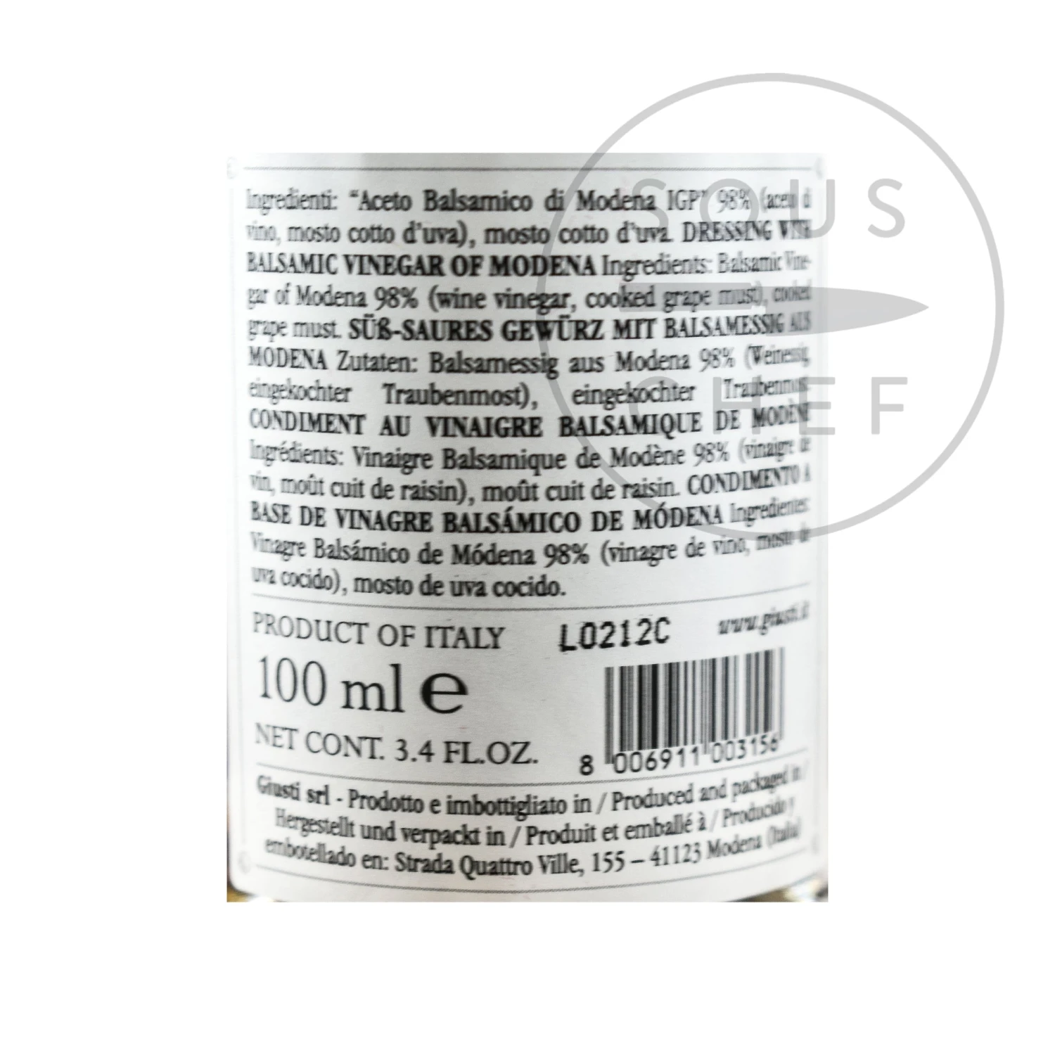 Ingredients: Balsamic vinegar of Modena 98% (cooked grape must, wine vinegar), cooked grape must. Contains sulphites.