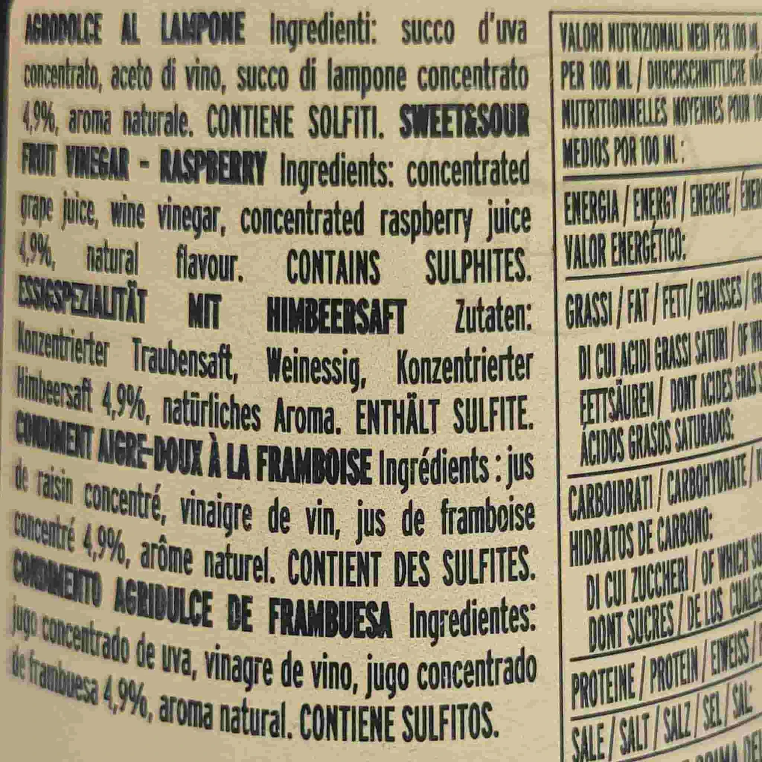 Ingredients: Concentrated grape juice, wine vinegar, concentrated raspberry juice 4.9%, natural flavour.