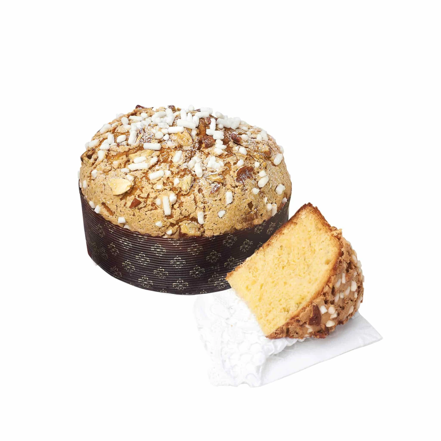 Loison’s classic Veneziana is a traditional Italian cake with its roots in Venetian culinary history. It has a sweet, bread-like texture similar to panettone. The dough is enriched with fresh Italian butter, Mananara vanilla from Madagascar and a blend of fine spices which give the cake its unmistakable aroma and flavour. It’s covered in sweet icing and garnished with almonds and granulated sugar.