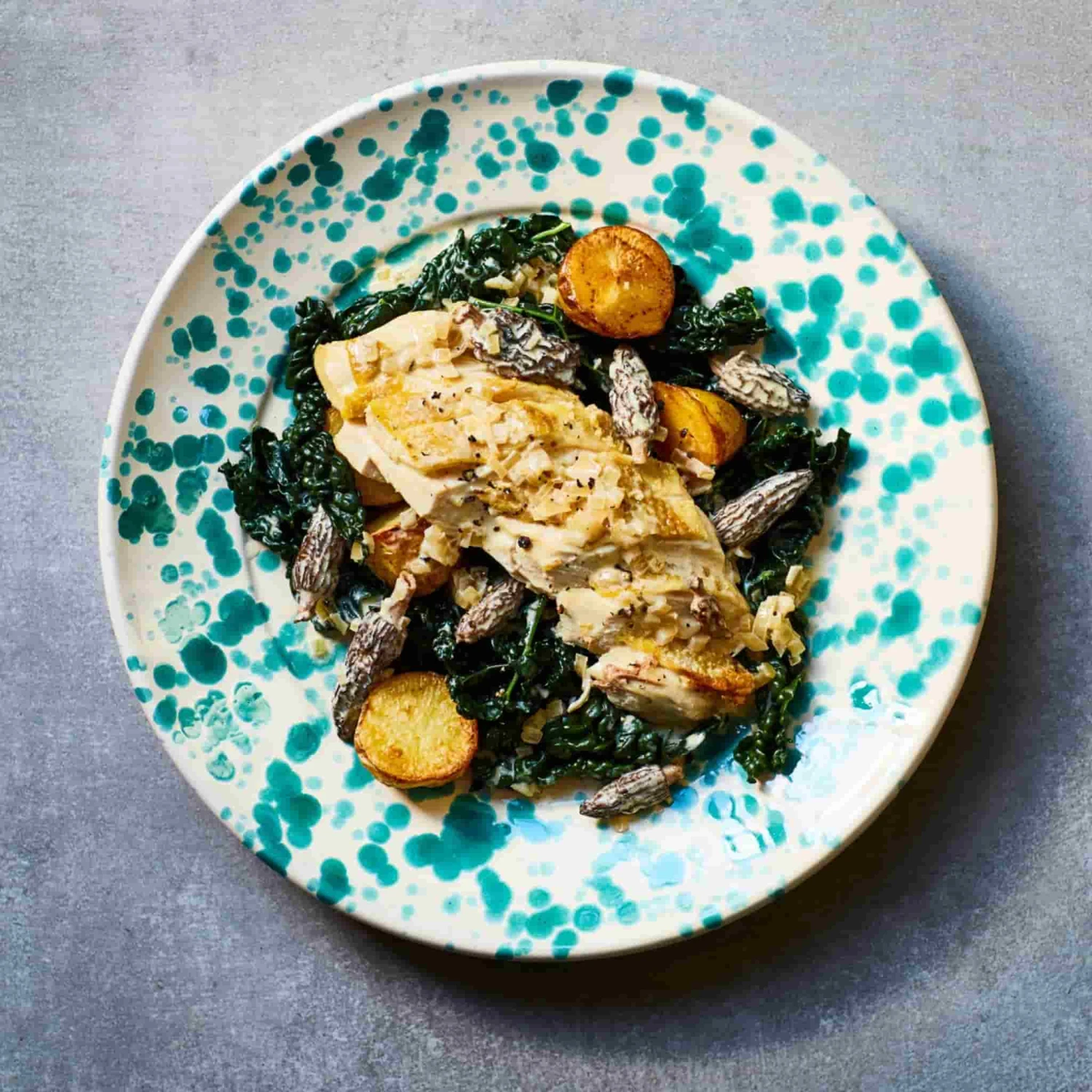 The Puglia aquamarine splatter dinner plate is a striking way to serve rich ragus, sourdough pizzas and towering lemon meringue pies.
