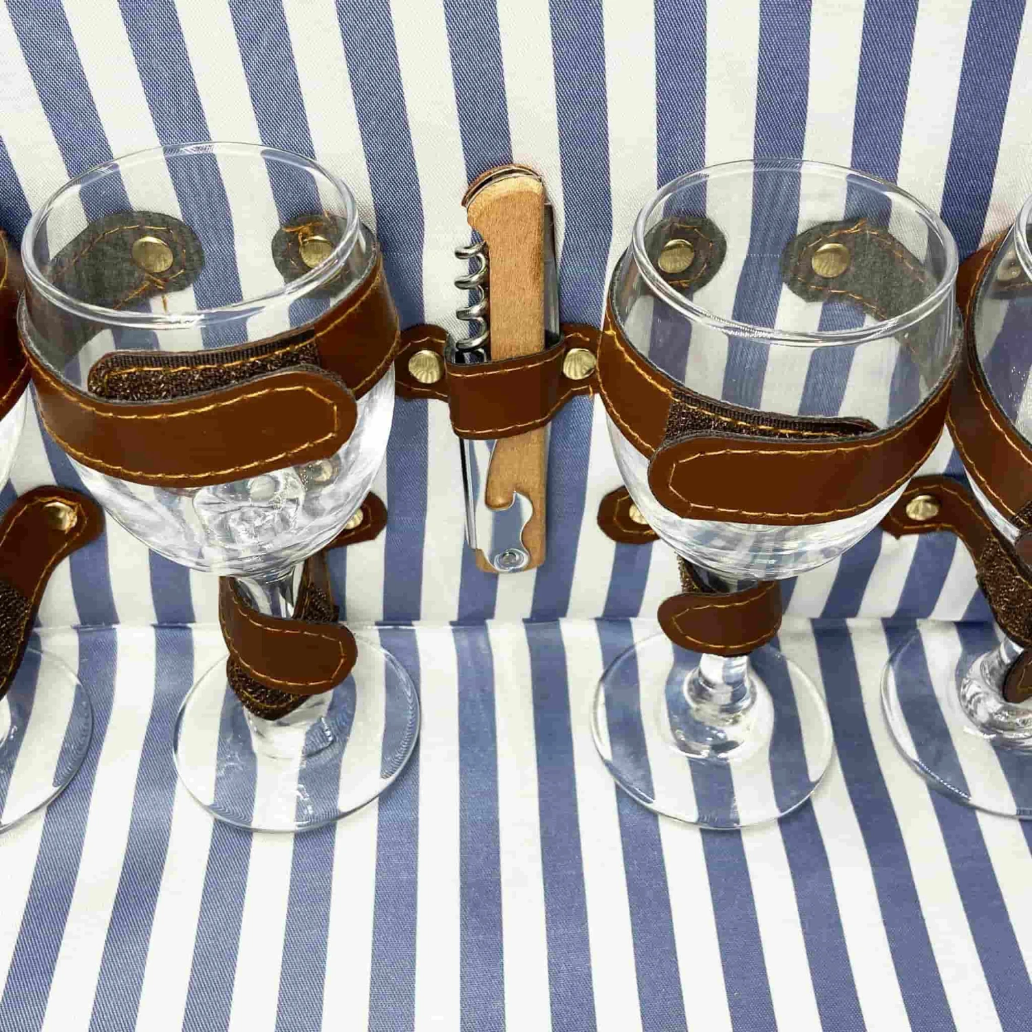 The Saint-Malo blue striped picnic basket is one of the most innovative hampers designed by Les Jardins de la Comtesse. Once you’ve found the perfect picnic spot, you can unfold the metal legs beneath the wooden lids to use as a small table. There are four notches on the sides of the table to hold your wine glasses while you relax in the sunshine.